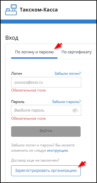 Открыть страницу входа в кабинет "Такском-Касса" на вкладке "По логину и паролю" и нажать Зарегистрировать организацию: