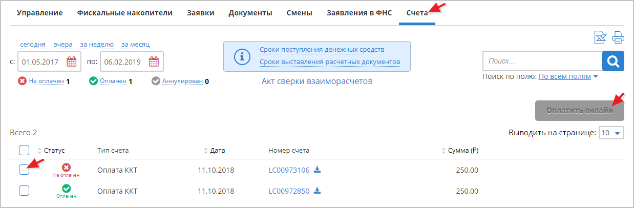 Если в списке есть ККТ со статусами "Заканчивается оплата" или "Не оплачена", в строке данных этих ККТ есть ссылка для онлайн-оплаты и информация по поиску счета в разделе "Счета":